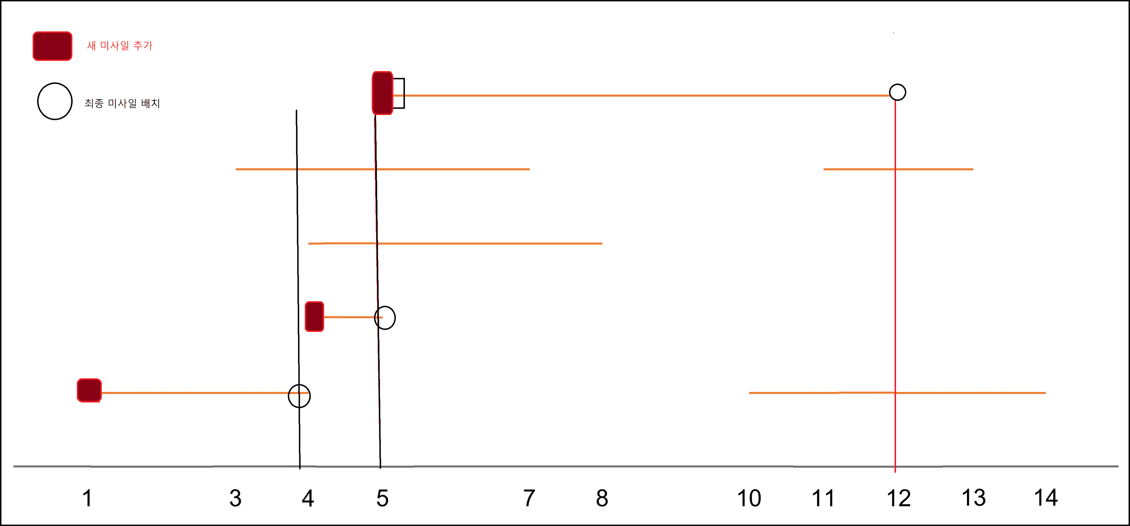 - 만일 새로 만난 타겟이 기존 미사일에 포함된다면, 새로 만난 타겟과 기존 타겟 중 오른쪽 끝이 더 짧은 쪽에 배치한다.